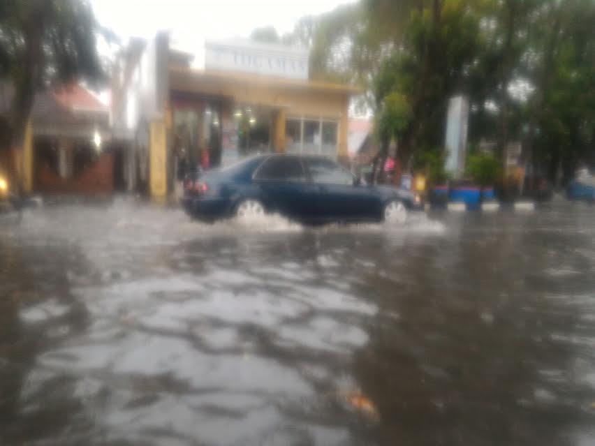 Bojonegoro Kota – Hujan deras yang mengguyur dalam kota Bojonegoro sore hari ini, Rabu (22/02/2017) sejak sekitar pukul 14.00 tadi menyebabkan beberapa ruas jalan utama tergenang air. Nampak dalam foto, air menggenangi jalan sebatas betis orang dewasa.