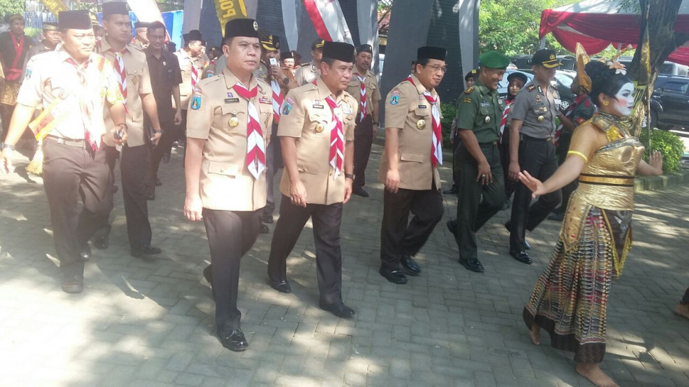 Nampak apel berjalan dengan tertib diikuti ribuan peserta dari Saka Bhayangkara dan kader pramuka dari berbagai perwakilan dan daerah di Jawa Timur. BUpati Bojonegoro Drs H Suyoto dan beberapa pejabat Pemkab juga hadir, juga Kapolres Bojonegoro AKBP Wahyu Sri Bintoto serta Dandim 0813 Kapten Inf Heri Subagyo. (her/moha)