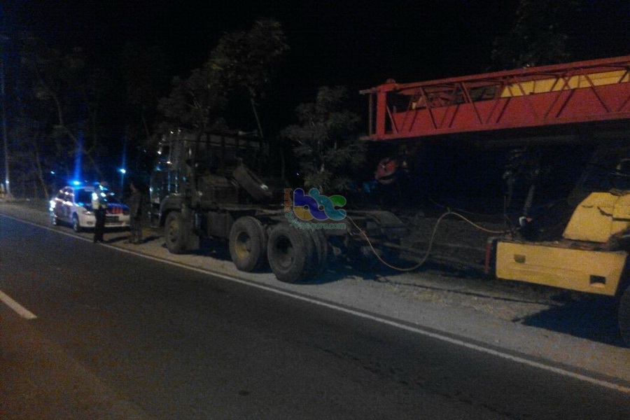 “Tiba-tiba muatan crane yang dibawa mengenai lampu traffick light, tiang telkom, lampu PJU dan pohon penghijauan di tepi jalan sebelah barat,” ungkap Joko Susilo.