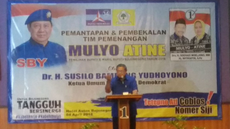 Bojonegoro Kota - Presiden RI ke-6 yang sekaligus Ketua Umum Partai Demokrat, Susilo Bambang Yudhoyono (SBY), turun gunung untuk memberikan pemantapan dan pembekalan terhadap Tim Pemenangan pasangan calon Bupati dan Wakil Bupati Bojonegoro “Mulyo - Atine, yang diusung Partai Demokrat dan Partai Golkar, dalam Pilkada Bojonegoro, 27 Juni 2018 mendatang.