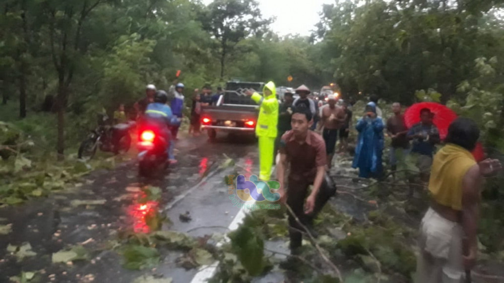 Bojonegoro - Akibat hujan deras yang disertai angin kencang yang terjadi di hampir seluruh wilayah Kabupaten Bojonegoro pada Jumat (31/01/2020) sore, mengkibatkan sejumlah pohon di ruas jalan jurusan Bojonegoro - Nganjuk, tepatnya di Dusun Sampang Desa Buntalan Kecamatan Temayang Kabupaten Bojonegoro roboh atau tumbang.