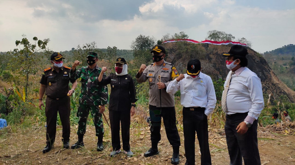 Forkopimda Bojonegoro, saat hadiri pembentangan bendera merah putih sepanjang 75 meter di Bukit Watu di Desa Krondonan Kecamatan Gondang Kabupaten Bojonegoro, Senin (17/08/2020)