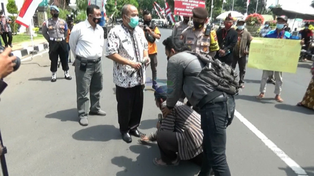 Sementara itu, koordinator aksi Edi Ronggo langsung memberikan pertanyaan terkait dengan apa yang disampaikan Sulistiyadi di hadapan para pendemo.