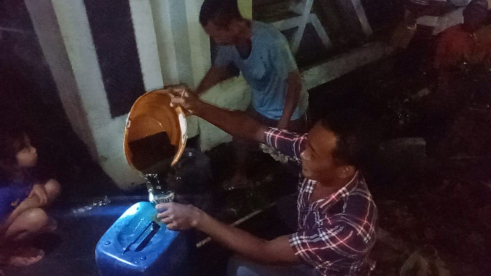 Warga yang mendengar ada minyak mentah mengalir di selokan pun berduyun-duyun membawa jeriken atau wadah untuk mengambil minyak. Mereka menyaring minyak bercampur air dengan peralatan seadanya seperti kaleng dan botol air mineral.