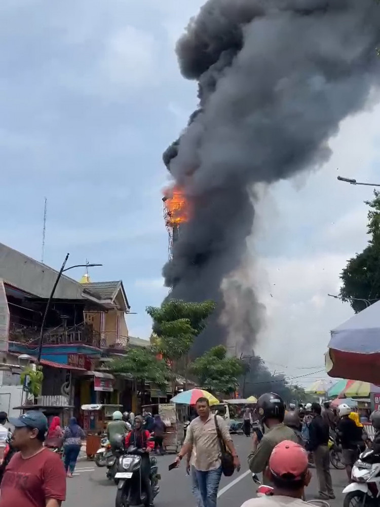 Bojonegoro - Menara Masjid Darussalam yang berlokasi di Jalan KH Hasyim Asyari, turut Desa Kauman, Kecamatan Bojonegoro Kota, Kabupaten Bojonegoro, tepatnya di barat Alun-alun Kota Bojonegoro, Jawa Timur pada Rabu (19/02/2025) sekitar pukul 10.30 WIB, terbakar.