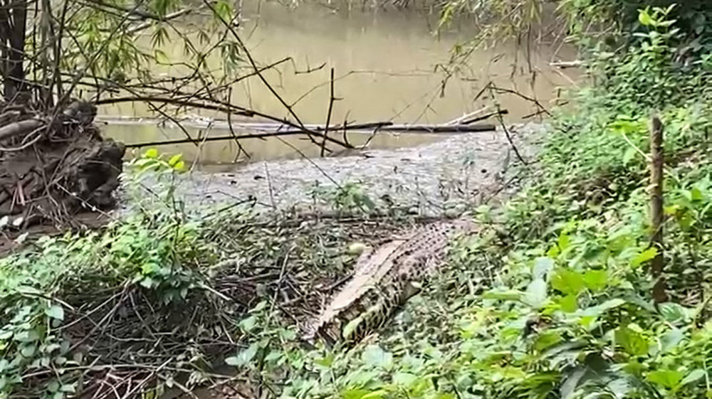 Seekor buaya yang muncul di pinggir Kali Jurang Marong, turut Desa Pagerwesi, Kecamatan Trucuk, Kabupaten Bojonegoro. Selasa (10/06/2025).(Aset: Istimewa)