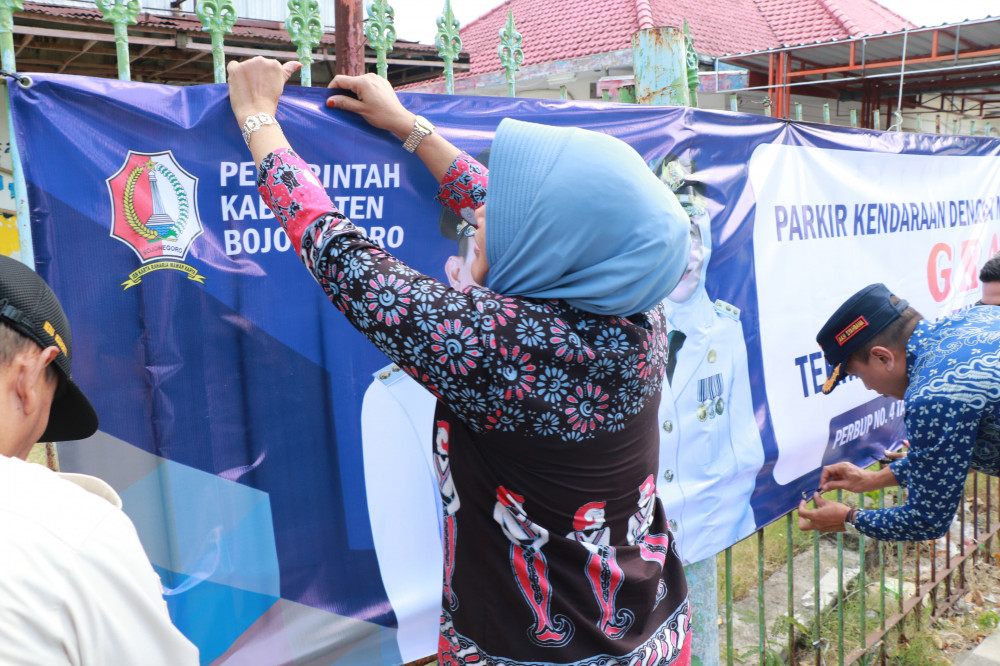 Dishub Bareng Wabup Bojonegoro Pasang Banner Parkir Gratis di Jalan Protokol