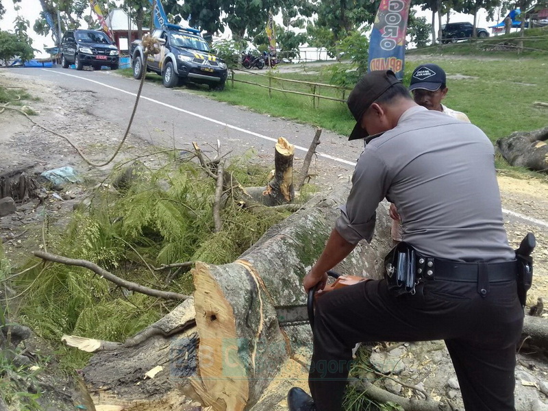 AKIBAT diterpa angin kencang pada Senin (06/02/2017) sekira pukul 13.00 WIB, pohon penghijauan yang berada di pinggir jalan poros Desa Deling Kecamatan Sekar Kabupaten Bojonegoro, tumbang. Dalam peristiwa ini tidak terdapat korban jiwa, namun pohon tumbang dengan diameter lebih 50 centimeter tersebut sempat menutup akses jalan menuju lokasi wisata Atas Angin.