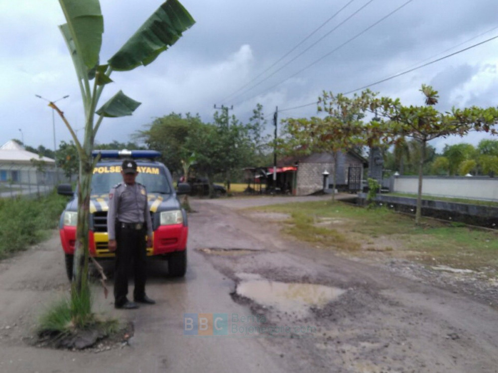 “Benar warga menanaman pohon pisang di tengah jalan, tepatnya di depan Balai Desa Gayam. Warga menuntut supaya jalan segera diperbaiki,” terang Kapolsek.