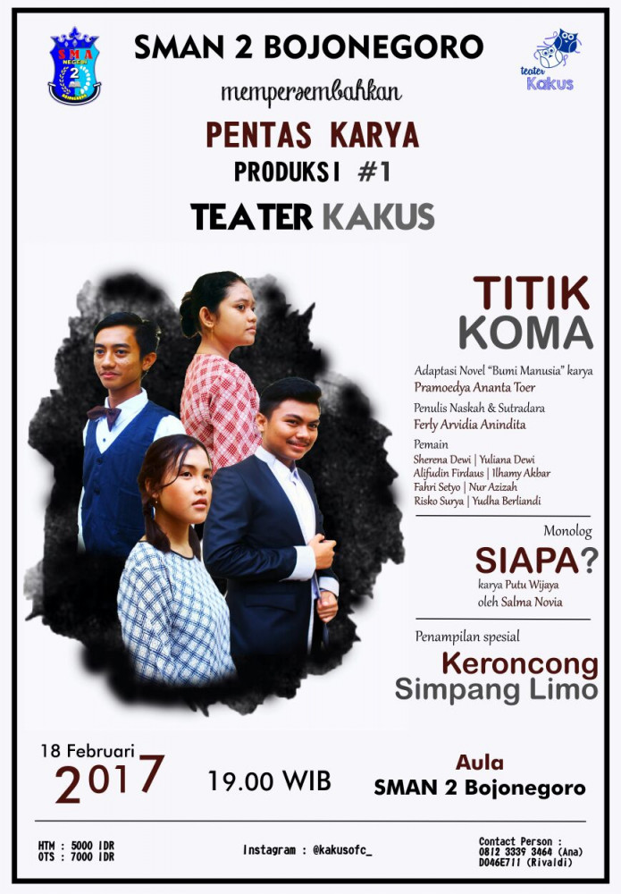 Bojonegoro Kota - Teater Kakus SMA Negeri 2 Bojonegoro bakal menggelar pertunjukan drama realis bertajuk Titik Koma, Sabtu malam besok (18/02/2017) pukul 19.00 WIB di ruang pertemuan Smada Jalan HOS Cokroaminoto. Naskah Titik Koma sendiri merupakan kreasi atas pembacaan terhadap novel Bumi Manusia karya almarhum sastrawan asal Kabupaten Blora, Pramoedya Ananta Toer.